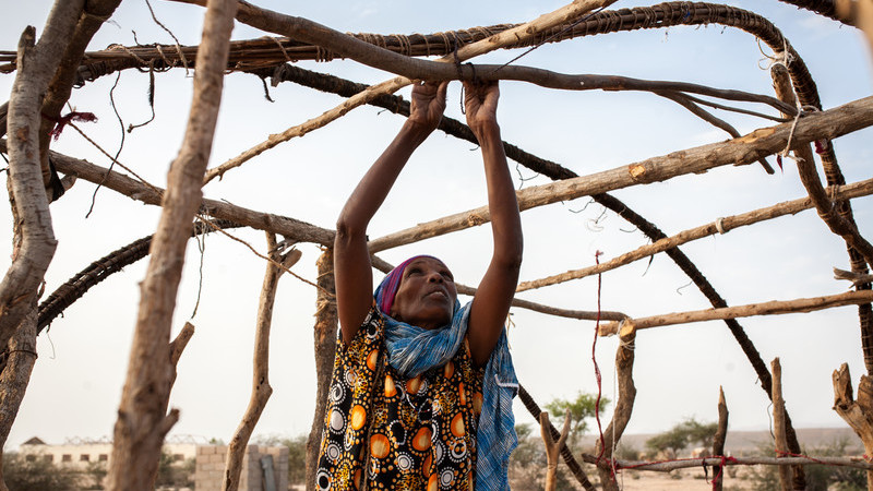 - Mustafa Saeed/CARE 2018: Families starting to build temporary shelters following Cyclone Sagar in Gargaara, Somalia.