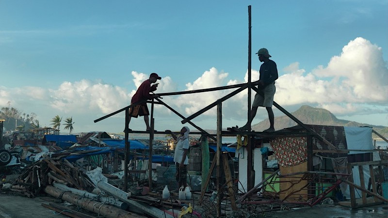 Peter Caton/CARE 2013: Residents rebuilding their home after it was destroyed by typhoon Haiyan, Philippines.